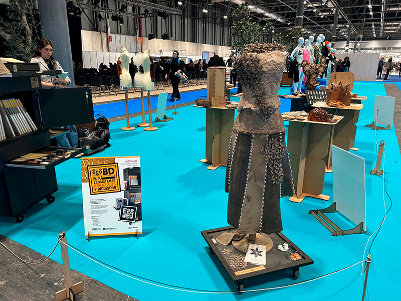 Entre las piezas expuestas se incluyen bolsos elaborados a partir de gelatina combinada con salsa de soja, vainilla o vino tinto, así como tops, vestidos y gorras desarrollados con materiales de origen vegetal, como la zanahoria, junto a otros compuestos experimentales. La presencia de estos proyectos permite a los profesionales conocer de primera mano nuevas líneas de investigación con potencial de futura aplicación en la industria, reforzando el papel de Momad como plataforma de innovación y reflexión sobre el futuro sostenible del sector.